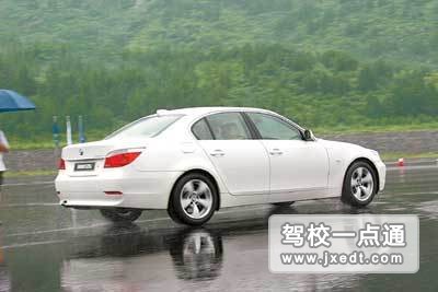 雨中行车时,路面上的雨水与轮胎之间形成“润滑剂”,使汽车的制动性变差,刹车距离会加长,所以行车时应保持一定的安全距离,防止侧滑。