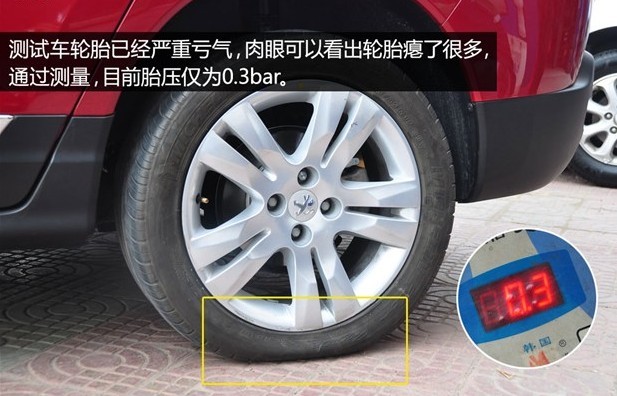 我们模拟这样的场景,将一条被钉子扎穿的轮胎换到我们的测试车上,此时钉子没有被拔出,轮胎已经接近完全没气的状态了。测量胎压,此时胎压仅为0.3bar,我们开始利用自动充气补胎液为轮胎修补充气。