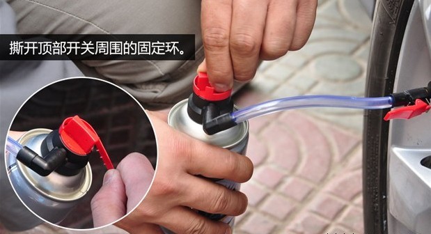 按照说明书上的使用介绍,首先我们要将压缩气罐拿在手中快速晃动摇匀,1分钟左右即可。随后将外侧的导管提起,接口与轮胎气门嘴对接。撕开瓶体上开关旁边的一圈固定环,将开关置于“on”的位置,补胎液就开始自动工作了。