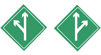 | 23、图中标志是分流诱导标志,表示前方有分流车道,车辆应按箭头方向直行或驶出主车道。 正确 错误 正确答案: