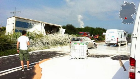 报道称,当时这辆货车正从海尔布隆(Heilbronn)驶往曼海姆(Mannheim),在A6公路上与另一车辆相撞。事故发生时,车上装载的3000升白色颜料洒满了路面,不仅如此,数辆路经此地的车也遭受了牵连。