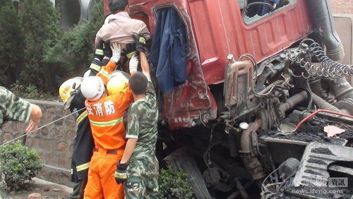 新安县大队接到报警后,迅速出动赶赴现场施救。到达现场后,消防官兵看到一辆中巴车和一辆半挂车相撞,中巴车驾驶员一侧严重破损,车身横在国道上,中巴车旁躺着4名伤员。半挂车左侧车身也严重破损,车头经撞击,已经严重变形趴在路基护体栏上,半挂车驾驶员被卡在驾驶室内。