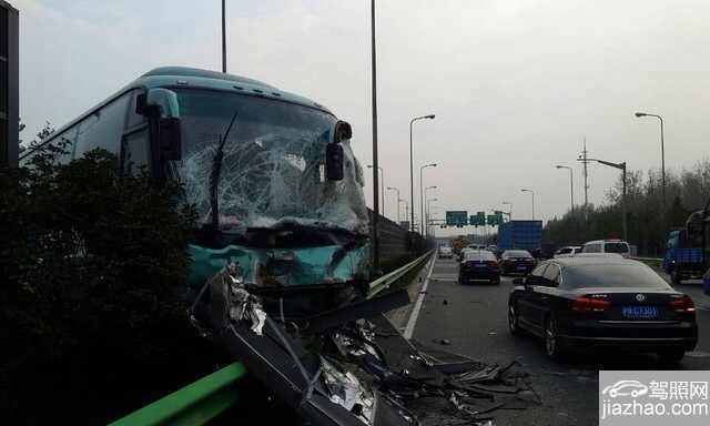 上海:外环S20内圈杨高路路段大客车冲过隔离带 对面车道6辆小客车连环追尾 大客车司机等人受伤