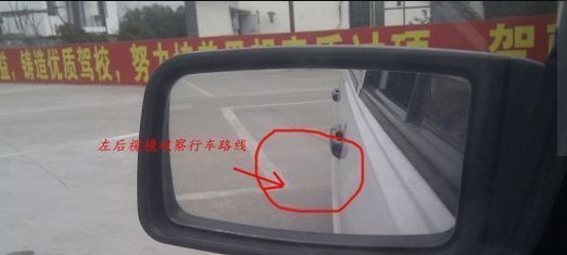 打死方向盘后,看后视镜,通过后视镜观察库角和车身延长线的距离(下图是左倒库, 教练一般认为延长线不好看,指定让你看前把手和库角距离)